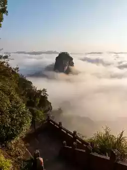 The Wangxian Tower viewing platform offers a perfect vantage point over the sea of clouds; in the distance, Incense Burner Peak appears faintly through the mist, and the clouds churn beneath your feet, evoking the feeling of "sword flying." Climb stone steps to see wonders like "One Line Sky" and "Little Pot Sky," with red rocks burning like fire under the sun. After rain, the Yuxu Palace hanging plank road is most stunning, with mist rolling up from the valley, seemingly within reach of immortality. At dusk, listen to Taoist priests at Taisu Palace and watch the sunset gild the golden peak.