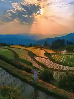 The most breathtaking sight is the layered terraced fields meeting the golden sunset! Standing in the fields, watching the warm sun dye the mountains amber, the whole world seems like a spilled palette🎨 Every shot looks like a masterpiece!