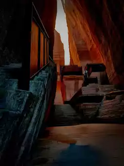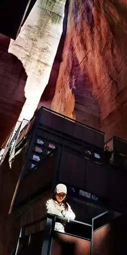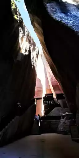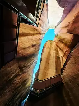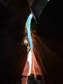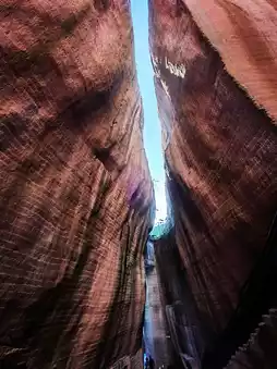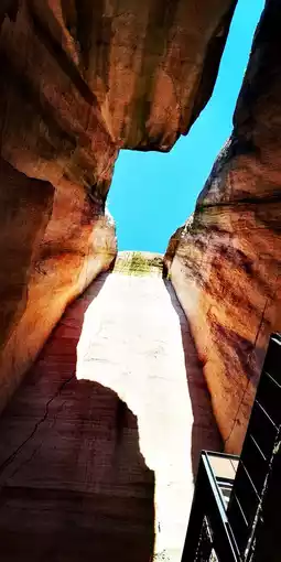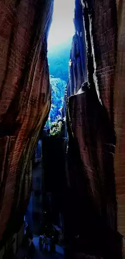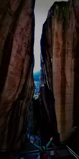 a. "One Line Sky" Perspective: Look up at the narrow strip of sky overhead, with sunlight streaming through the gap. Using the blue sky and rock crevices as the background, shoot a person gazing upward to reflect the grandeur of nature and the smallness of humans.