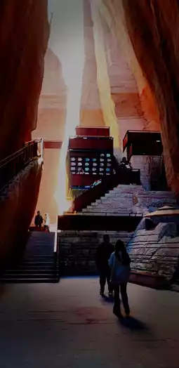 ① Architectural Structure: With a clear height of 38 meters and a depth of about 50 meters, the top is completely open, creating a naturally lit open-air space. The original rock walls are preserved, incorporating modern design elements through a zigzag stone path (about 20 meters long), stepped stone platforms, and bamboo nanmu bookshelves.