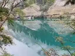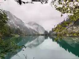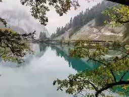 The beauty of Jianzhu Lake changes with your perspective. Look across the valley to see a dramatic scene where the misty mountains and their reflections merge into a vast painted scroll. By the shore, through a frame of green bamboo and leaves, the view becomes quiet and intimate. The water shines in jewel-like blues and greens, revealing even the sunken calcified logs and creating a detailed, picturesque scene.