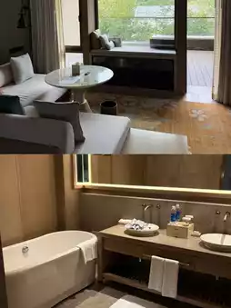 The room is decorated to be both cozy and elegant, with a big, soft bed that feels like being gently embraced by clouds. The panoramic floor-to-ceiling windows offer an unobstructed view of the beautiful scenery outside when the curtains are drawn. The bathroom is spacious with a dry and wet separation, and the toiletries are all from well-known brands, providing an excellent experience. The room also thoughtfully provides a humidifier, which is essential given Jiuzhaigou’s humid climate, so there’s no need to worry about dryness.