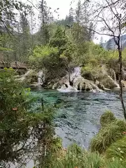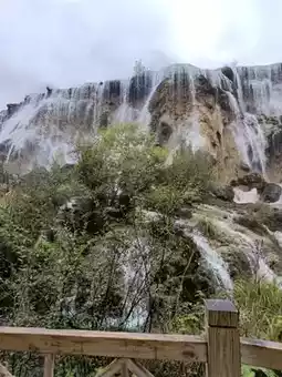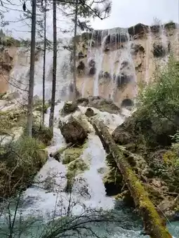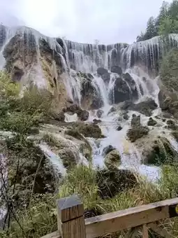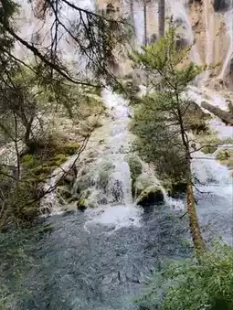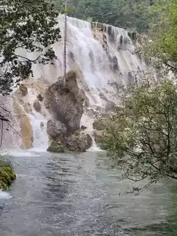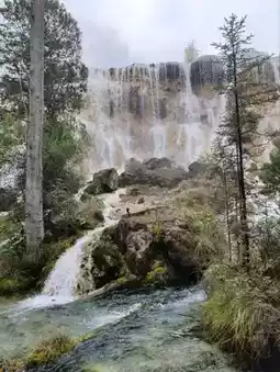 Located in the Rize Gully of Jiuzhaigou, Pearl Shoal Waterfall is one of the largest travertine waterfalls in the scenic area. Perched at a high elevation and spanning an impressive width, it is fed by melting snowwater that cascades forcefully onto the uneven travertine surface. The impact sends countless glistening water droplets flying into the air, resembling scattered pearls—hence its name. With its majestic and powerful presence, the waterfall produces a deafening roar as its churning, whitish waters rush down, making it the most turbulent and thunderous rapid in all of Jiuzhaigou.