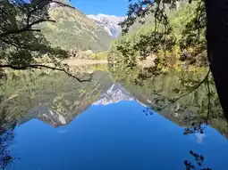 Mirror Lake – The glassy surface perfectly showcases the surrounding forest.