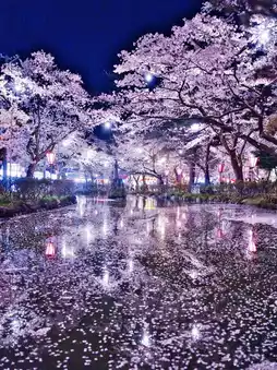 * The illuminated cherry blossoms at night are breathtakingly beautiful.