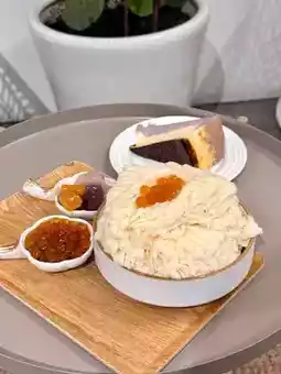 - Four Beans: Relished oolong tea shaved ice topped with chewy taro balls and paired with a side of rich taro cheesecake.