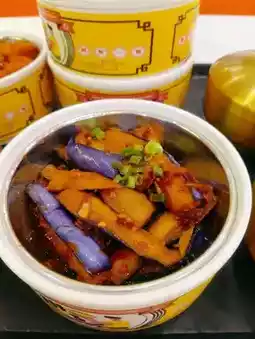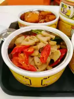 A set of Chinese dishes served in metal containers, likely for a meal. I had order the dishes may include: