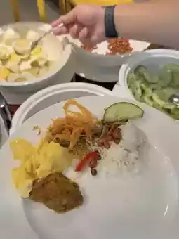The nasi lemak corner is another highlight, featuring fragrant coconut rice, crispy anchovies, boiled eggs, peanuts, and the signature spicy sambal that adds just the right kick. For those looking for something heartier, rendang makes an appearance—a slow-cooked, tender meat dish rich with spices and coconut milk, offering a taste of authentic Malaysian cuisine.