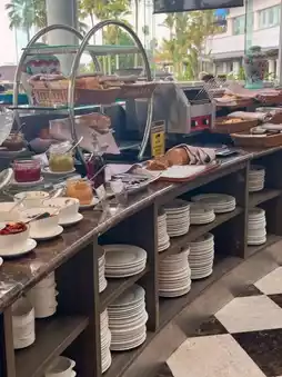 Crowded breakfast at peak hours – seating and food stations can feel busy