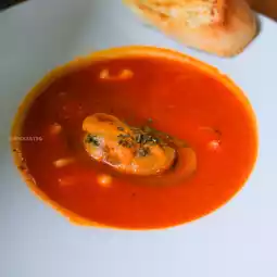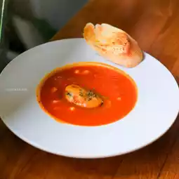 The minestrone featured a tangy, savory tomato-based broth enriched with seafood such as prawns, mussels, and squid. Paired with crusty bread on the side, it was perfect for dipping into the flavorful soup, making for a satisfying and hearty meal.