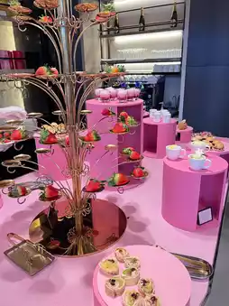 When you enter, you are greeted by all the desserts in the world made with strawberries. As soon as you sit down, you can choose a welcome drink and coffee or tea and use the buffet right away. Those who love desserts will be able to taste heaven.