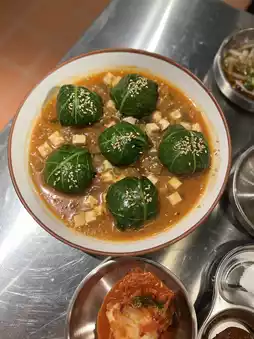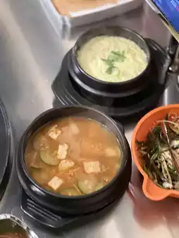 The accompanying side dishes, doenjang jjigae (soybean paste stew), and kimchi jjigae (kimchi stew) are also excellent,