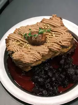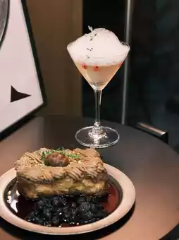 The space is designed with a cozy atmosphere combining black and deep wood tones, exuding a modern and sophisticated vibe. It also features an outdoor terrace, perfect for enjoying the autumn ambiance.