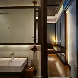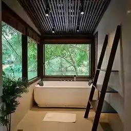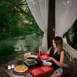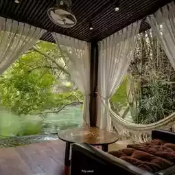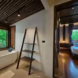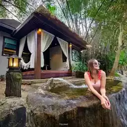 And the highlight corner is the natural pool. It's a bathtub outside the house. Soak and feel cool and refreshed. It's like playing in the river. And still surrounded by nature, you can enjoy the river view.