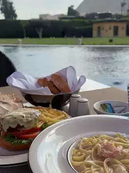 At the hotel's restaurant, you can enjoy a meal with the majestic pyramids right in front of you. Sitting on the open terrace, you'll be treated to a breathtaking view of ancient ruins as the backdrop. From traditional Egyptian cuisine to international dishes, the diverse lunch menu completes your leisurely travel experience. Every bite is a moment of awe. 🌄🥗🍞