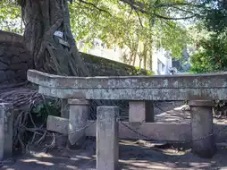 The torii gate has been designated a natural monument of Kagoshima Prefecture, and next to it is a magnificent old aco tree that miraculously survived the great Sakurajima eruption π²
