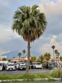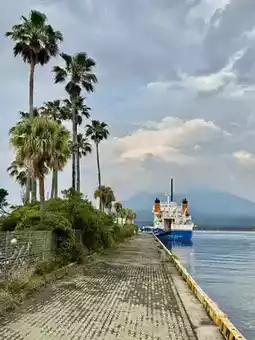 The pier stretches into the sea like a golden ribbon, guiding the gaze toward the horizon. Returning ferries slice through the calm waters, trailing delicate silver waves, while occasional dolphins leaping from the surface add a touch of lively vitality to the scene. Palm trees sway gently in the breeze, their broad leaves rustling as if whispering the ancient legends of the Satsuma Peninsula.