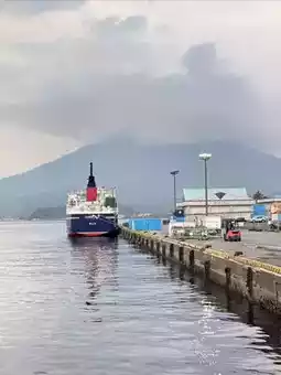 On the docks, small groups of tourists pause to take photos or lean against the railings, gazing into the distance. Their silhouettes blend seamlessly with the volcano, sea, and sky behind them. The air carries a faint saltiness, mingling with the sweet aroma of "volcanic ash ice cream" drifting from nearby cafés—a scent unique to Kagoshima.