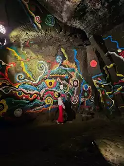 Artist Sadayuki Hagiwara's modern art murals, themed on a dialogue with the sun, moon, stars, and nature, create a mystical space. Visitors are enveloped in a ritual-like atmosphere.