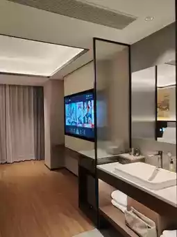 3️⃣ The large floor-to-ceiling windows are super beautiful. The room's washing area has a wet and dry separation design. The toiletries are all from the big brand Peter Thomas Roth, so you can use them with confidence and comfort. The Mengbaihe zero-pressure mattress doesn't make any noise when you toss and turn. The TV is a 65-inch large-screen TV that can be screen-casted, so it's super enjoyable to watch movies in the hotel.