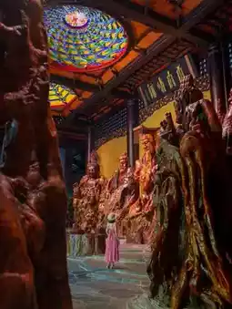 • Climb to the top for a panoramic view, wear Hanfu to pose with root carving Buddha statues, sunlight streams through the pagoda windows creating natural light and shadow.