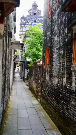Ruishi Tower is part of the "Jinjiangli Diaolou Cluster", which consists of 3 diaolou. Tickets are CNY 50 per person. Ruishi Tower is definitely a highlight of Kaiping diaolou. As it is a private building, it is recommended to spend CNY 20 to climb the tower (the owner will also explain the history of the diaolou in detail). In addition to climbing to the top for photos, there is a small green hill behind the parking lot at the entrance of the scenic area. You can climb up to take photos of the "First Tower" from a higher vantage point 😄; finally, there is the alley leading to Ruishi Tower (Figures 5-6).