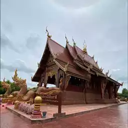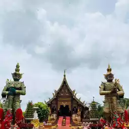 I had the opportunity to visit Wat Sawang Hua Nakham and pay my respects. The temple atmosphere is wonderful, especially the wooden chapel. If you have the chance, stop by and take a look. The temple is beautiful, with a wooden pavilion, very peaceful, and has a subtle northern vibe. Many people come to pay their respects to Thao Wessuwan. The temple is beautiful and clean, with beautiful pavilions and structures reminiscent of northern art. The wood is abundant, giving it a unique and beautiful look. People come to pray all day long, but it's not crowded. There's ample parking in front of the temple, making it convenient and convenient. There are also clean restrooms.