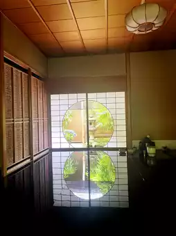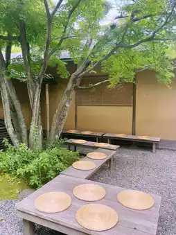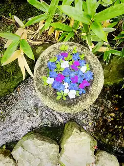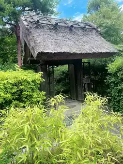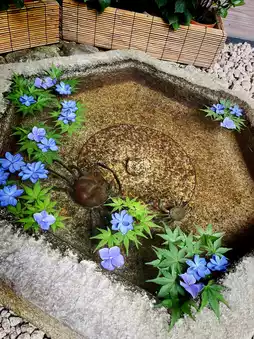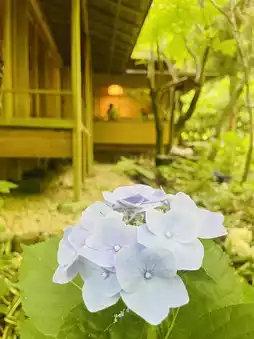 As you stroll through the beautiful garden, which changes with the seasons, you'll enjoy stunning views of the circular windowed teahouse, hydrangeas, the murmuring of a stream, fresh greenery, and the flower-shaped water basin. 🌿