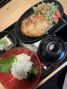 The menu is simple, mainly hamburger steak and rice combos, but the portions are just right — filling, but not overly heavy. The hamburger steak is freshly grilled, flavorful and not greasy, and the rice has a subtle sweetness that pairs perfectly with it. You can adjust the soy sauce to your taste, and the tofu is soft and silky — really delicious!