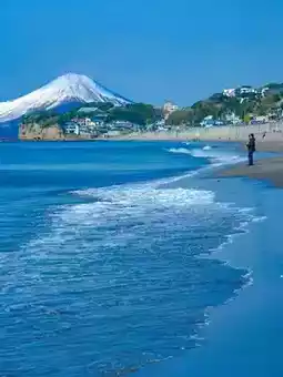 Walk from the station to the beach to capture beautiful views of Mt. Fuji and the waves together. A hidden spot near Kamakura Prince Hotel lets you shoot trains, houses, and the sea.
