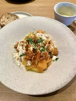 We enjoyed their pasta set for a weekend lunch: a fresh salad, chilled corn soup, tomato-based Amatriciana pasta, and a light dessert. Every bite was delicious, with a satisfying balance of flavor and portion. The atmosphere was relaxed, stylish, and far from the weekend crowds you’d expect in Kamakura.