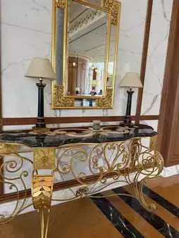 Marble lobby, gold chandeliers, and a pool leading to the sea.
