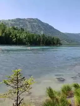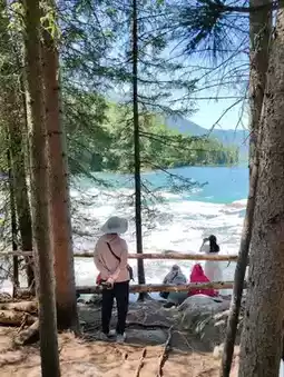 Kanas Lake, with its emerald-like waters and lush surrounding pine forests, forms a breathtaking natural masterpiece. The clear lake water shimmers under the sunlight, beautifully complementing the vibrant green vegetation along the shore. Many tourists are captivated by this stunning scenery, stopping to admire it or capture the picturesque views with their cameras, preserving these beautiful memories.