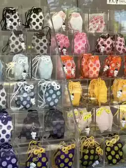 The charms and stamp books lined up at the shrine office are also polka dotted