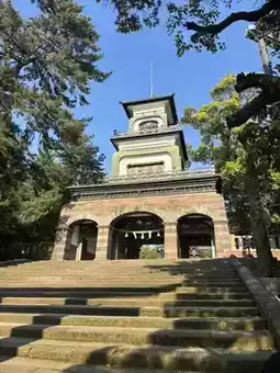 The shrine gate, adorned with stained glass, is registered as an Important Cultural Property of Japan.