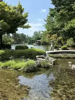 A summer visit to Kenrokuen Garden in Kanazawa is perfect for a leisurely stroll. Lush greenery, with trees, ponds, and bridges creating a picturesque backdrop, provides a refreshing coolness even on a summer afternoon. Walking along the winding paths, you'll discover the garden's six famous scenic spots and eight scenic views: the reflections of Kasumiga Pond, the shadows of bamboos beside the Huizhen lanterns, the Goose-shaped Bridge, the fountain, the Goose Pond, and the moss path. Each has its own unique charm, perfect for photographing or simply sitting quietly.