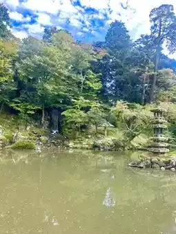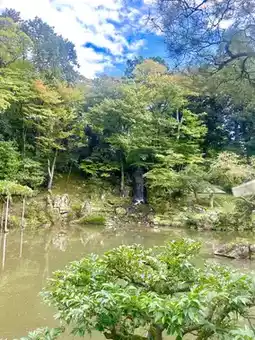 The trees and lanterns reflected on the water's surface are stunning, adding to the garden's tranquility.