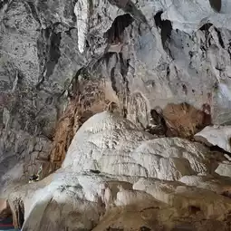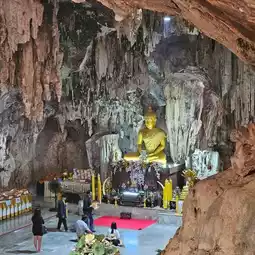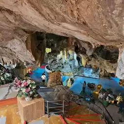 Wat Tham Phu Wa, Kanchanaburi is a temple outside the city, located on the edge of a mountain. It is a temple with a large cave hall. In front of the cave is a large ancient Khmer sandstone castle in brown and red. It is large and has beautiful patterns. The surrounding atmosphere is surrounded by mountains and flowers. It is shady and clean. When walking into the cave, there are beautiful stalactites and stalagmites. The inside of the cave is quite clean. The floor is covered with marble tiles. It is well maintained and has good ventilation. During holidays, there are many Thai and foreign tourists and pilgrims. There is also a large area outside. It can park thousands of cars. The temple is also suitable for meditation and outdoor activities. It can accommodate more than 300-500 people.