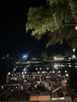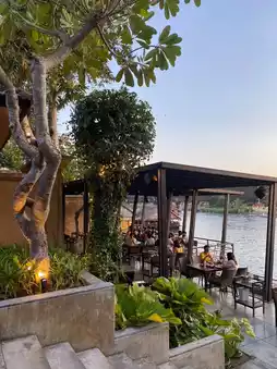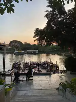 💚 When traveling to Kanchanaburi, a place that you must not miss is the bridge over the River Kwai. According to our plan, we planned to eat at this restaurant. But it is suitable because it is almost right next to the bridge over the River Kwai. You can also walk from the bridge. The restaurant is beautifully decorated in a Bali style mixed with a bit of Thai. If you bring your lover on a date, it is the perfect answer. It is even more romantic when it gets dark because you are eating in the middle of the river.