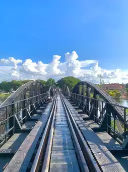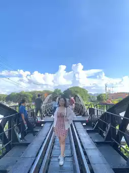 The Bridge on the River Kwai is a large bridge over the Kwai River with a semicircular steel structure, alternating with a truss structure and reinforced concrete piers. It is located in Tha Makham Subdistrict, Mueang Kanchanaburi District, Kanchanaburi Province, north of the city. It is currently used as a route for the Thonburi - Namtok Railway or the Death Railway. In the past, the weather was very hot when we went, but it was beautiful. Anyone who goes to visit, I recommend the evening when the bridge will have beautiful lights on. #VisitKanchanaburi #BridgeOnTheRiverKwai