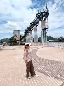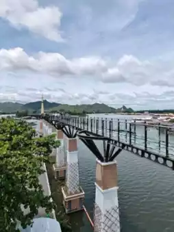 🐻 Hello, today I will take you to visit the skywalk in Kanchanaburi. This place has been open for a short time and is very beautiful. The sky walk here is next to the Kwai River. We can walk up to see the beauty from a high angle of the skywalk. The view is very beautiful. There is no admission fee. It is open every day. The bottom of the sky walk is also beautiful. There are many photo spots. Come and visit.