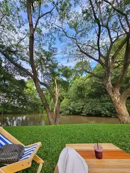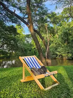 There are several seating areas, including an outdoor area for relaxing on canvas chairs by the garden, an indoor area with air conditioning, and another area with a garden view to suit your mood.