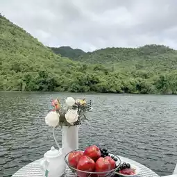 A floating raft in the middle of the Srinakarin Dam, surrounded by 360° of nature, cool breezes, and crystal-clear water. There's a cafe serving coffee, tea, and homemade desserts, as well as a riverside relaxation area. Activities include SUP boarding, kayaking, and swimming directly from the raft.