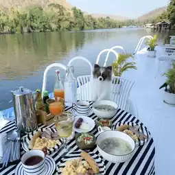 A floating raft in the middle of Srinakarin Dam, surrounded by mountain views and crystal-clear water, offers a peaceful atmosphere. There's a cafe serving aromatic coffee, homemade pastries, and main courses. Private raft rooms offer a cozy atmosphere, with activities like kayaking, swimming, and relaxing on a hammock by the water.