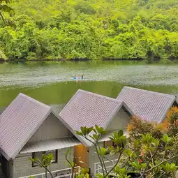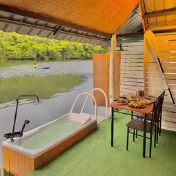 MAYA Erawan is a super chill raft accommodation with mountain and river views. Enjoy a relaxing soak in the tub, close to nature, or go kayaking to fully relax. There's also an Italian restaurant with a stunning view upstairs. It's the best! 🫶🏻