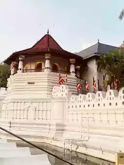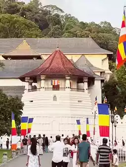 Architectural Harmony: A stunning blend of Kandyan royalty, Buddhist symbolism, and colonial influences—white walls, red roofs, and golden embellishments