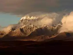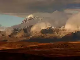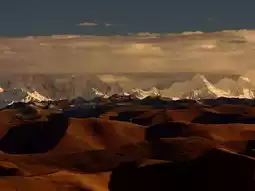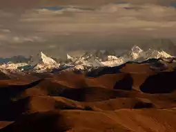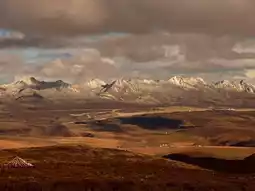 During autumn (2024), the autumn color of vegetation in the valleys and the rolling mountains were strongly enhanced in red coloration by the evening sun. Shadows of the rolling mountains, and direct sunshine of the setting sun shining onto the side of the snow mountains at the east horizon, enhanced the photography effects of the panorama.