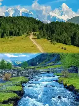 - Riou Village Stream (snow-capped mountains + flower reflections)