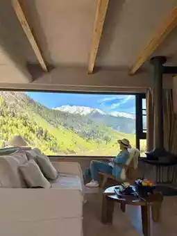 Rustic wooden furniture, combining aesthetics and quality, with 270° mountain-view rooms. Wake up and fall asleep to snow-capped peaks and starry skies.