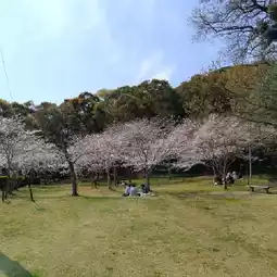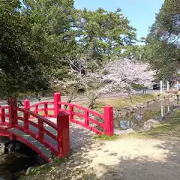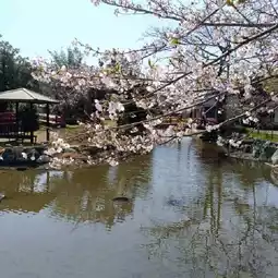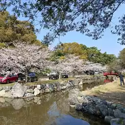 Kotohiki Park is one of the popular cherry blossom viewing spots in Kagawa Prefecture and Kanonji City. The main cherry blossom area is a narrow zone between the entrance of Kotohiki Hachiman Shrine and Kanda River, where the cherry trees are densely packed. The scenery is enhanced by small bridges and flowing streams, creating a picturesque view.